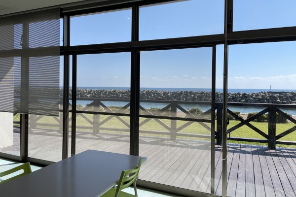 受付でチケットを見せると、食堂に案内されました。南向きで明るい陽の差す食堂からは日本海が望めます。