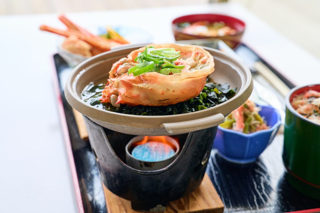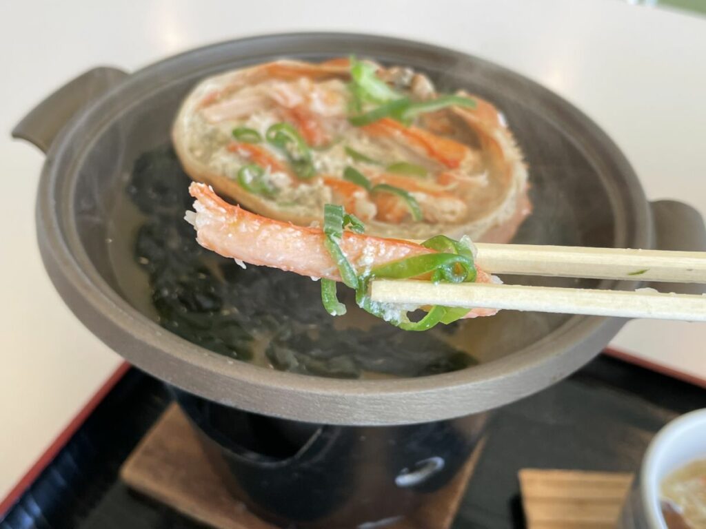まずは、ドーンと鍋に乗った紅ズワイ蟹の甲羅焼き。ぎっしり詰まったカニのほぐし身をカニみそにからめて食べると、お口いっぱいに広がる幸せなカニの風味が楽しめます。
