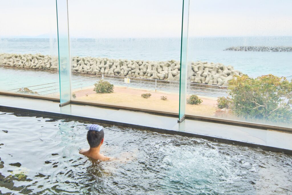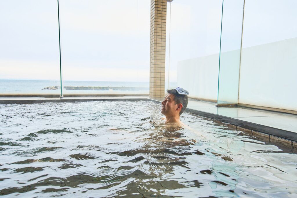 展望風呂からは、日本海を望むことができるオーシャンビューです。ちょうどよい湯温でのんびり浸かって、心と体をリフレッシュできました!